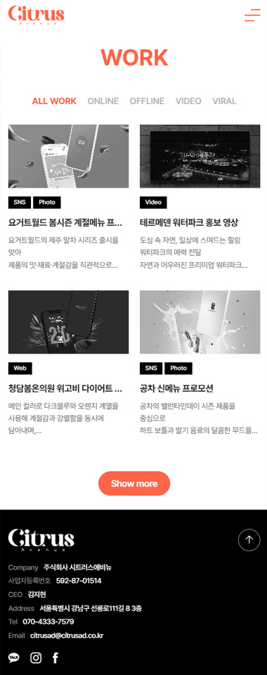 다양한 애니메이션 기법을 활용하여 시트러스애비뉴가 추구하는 마케팅 포인트를 제시함으로써 고객이 추구하는 니즈를 파악하는 데에 용이하도록 하였고, 포트폴리오를 제공할 때에는 이미지를 중심으로 타이틀과 정보를 함께 보여주어 관심을 유도할 수 있게 제작되었습니다.
